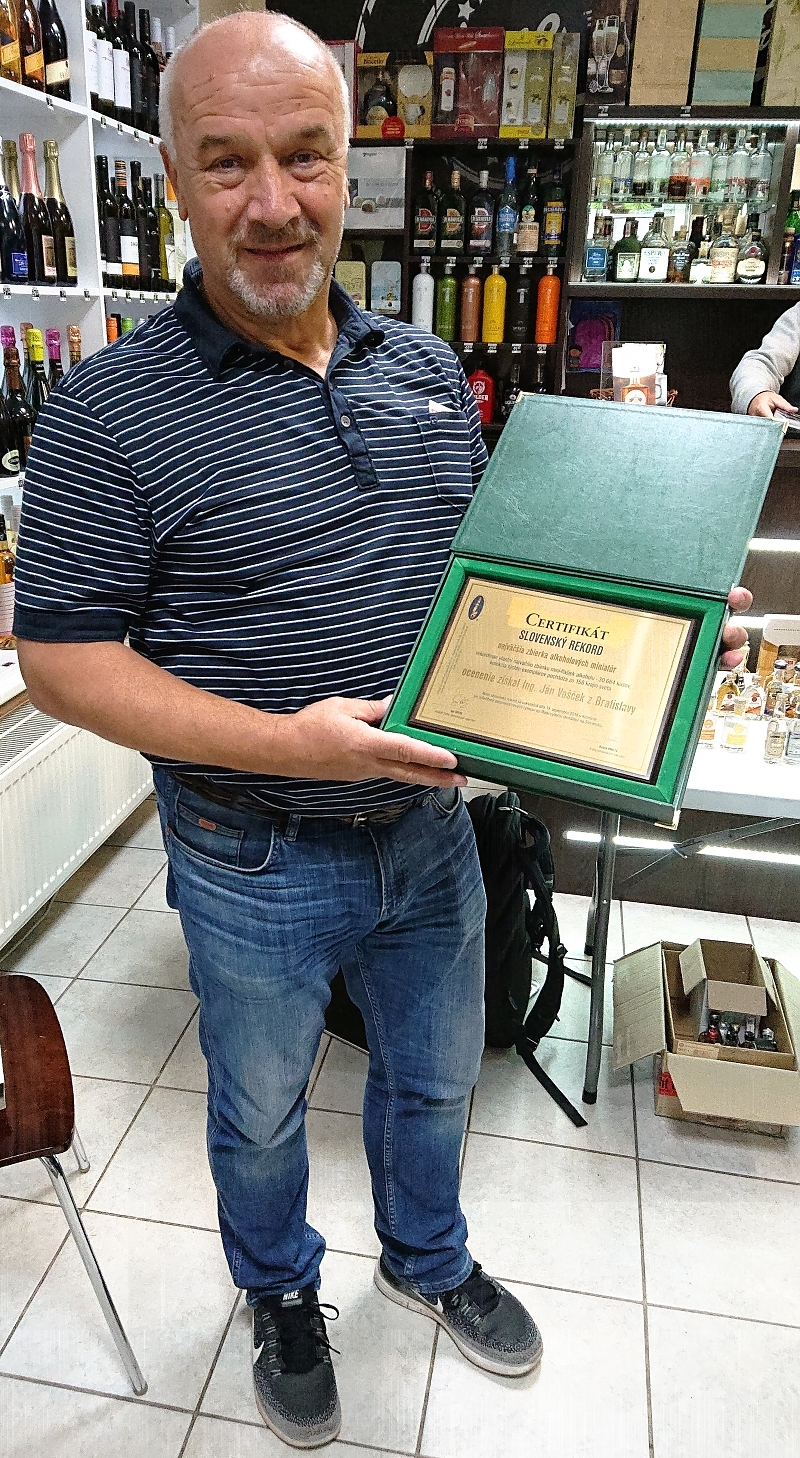 Certifikát Slovenský rekord najväčšia zbierka alkoholových miniatúr rekordman vlastní najväčšiu zbierku mini-fľaštičiek alkoholu - 30664 kusov, kolekcia týchto exemplárov pochádza zo 156 krajín sveta ocenenie získal Ing. Ján Vošček z Bratislavy Nový slovenský rekord sa uskutočnil dňa 15. septembra 2018 v Komárne pri príležitosti pasovania nových rytierov do Rádu rytierov destilátov na Slovensku